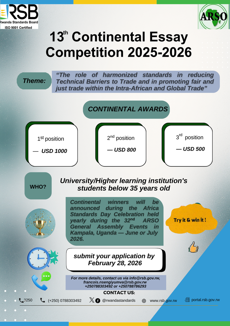 The deadline for submission of the essays is 28th February 2026 through email: arsocompetition@rsb.gov.rw.